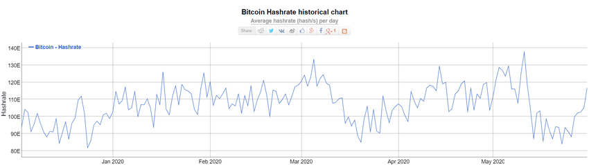 Die Hashrate für das Bitcoin-Netzwerk erreichte am Tag der Halbierung ein neues Allzeithoch, brach aber kurz darauf schlagartig ein. Am 23. Mai fiel die Hashrate dabei auf den niedrigsten Stand des Jahres 2020.