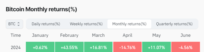 Diese Trends verstärken das Abwärtsmomentum des BTC Kurses und deuten darauf hin, dass er einen weiteren negativen Monat verzeichnen könnte. Laut Coinglass Daten ist Bitcoin auf dem Weg zu seinem zweiten negativen Monatsabschluss 2024, mit einem Rückgang von 4,56 Prozent im Juni. Bereits im April erlebte die Kryptowährung einen Rückgang von satten 14 Prozent.
