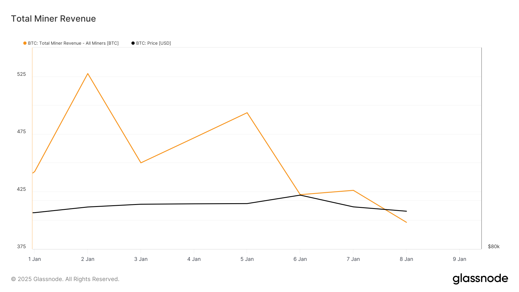 Der BTC-Miner-Umsatz aus Transaktionsgebühren und Blockbelohnungen fällt stetig seit dem 2. Januar. Laut Glassnode liegt er derzeit bei 398,20 BTC, ein Rückgang von 24 Prozent in der letzten Woche.