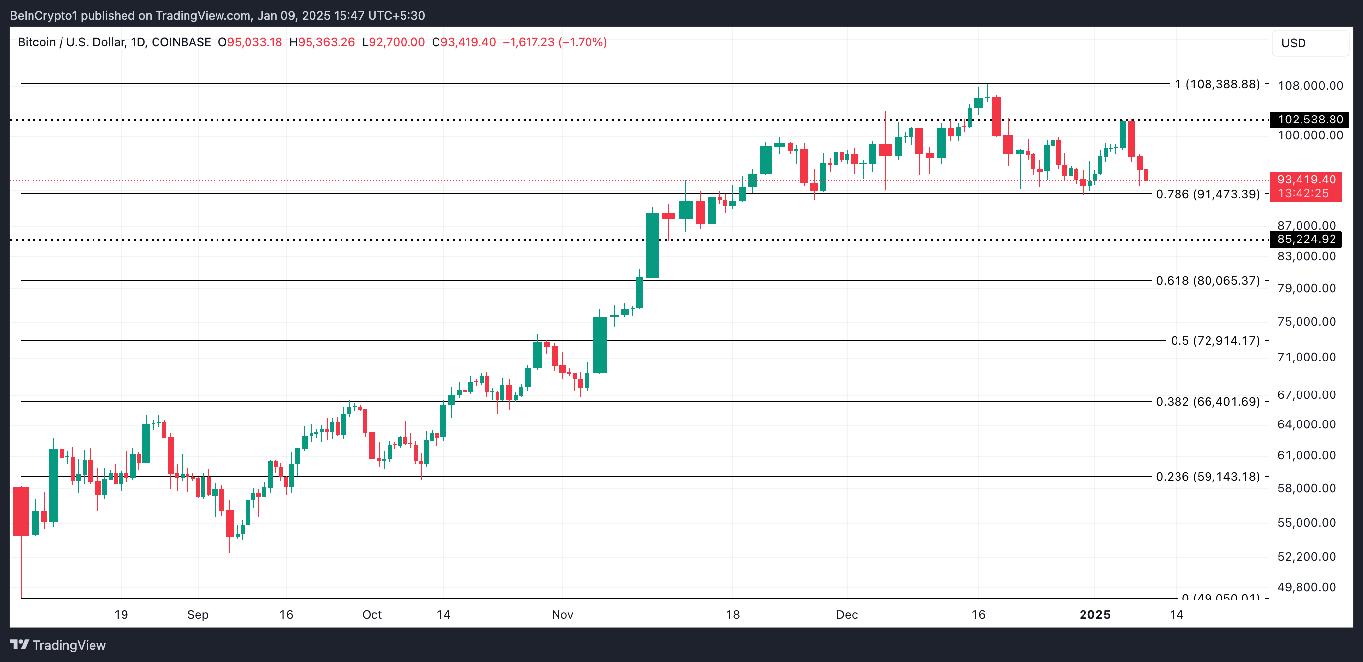 In den letzten zwei Tagen ist der Bitcoin stark gefallen. Zum Vergleich: Während der Handelssitzung am Dienstag erreichte die führende Kryptowährung kurzzeitig ein Hoch von 102.735 USD. Die Verkaufsaktivitäten nahmen jedoch schnell zu und drückten den Kurs des Coins nach unten. Aktuell dieses Berichts notiert BTC bei 93.419 USD.
