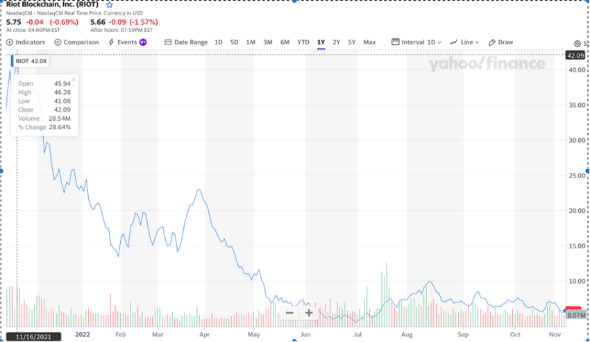 Auch die Aktien der Bitcoin Mining Unternehmen blieben vom diesjährigen Bärenmarkt nicht verschont. Zuletzt rutschte Riot (RIOT) um etwa 2 % ab und wurden zu einem Kurs von lediglich 5,75 US-Dollar gehandelt. Dieser erschreckende Preissturz begann genau vor einem Jahr: Zuvor verzeichneten die Aktie bei Yahoo Finance noch einen Wert von 42,09 US-Dollar und stürzte anschließend um über 80 % ins Bodenlose.