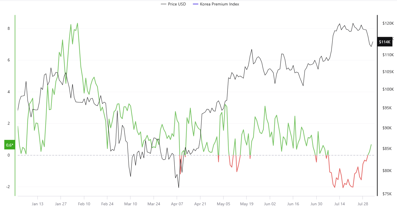 Die steigende Rentabilität spiegelt auch tiefere Nachfragedynamiken wider, wobei Daten zeigen, dass der aktuelle Kimchi-Premium in Südkorea bei +0,6 Prozent liegt. Dies deutet auf eine starke regionale Nachfrage nach BTC hin.