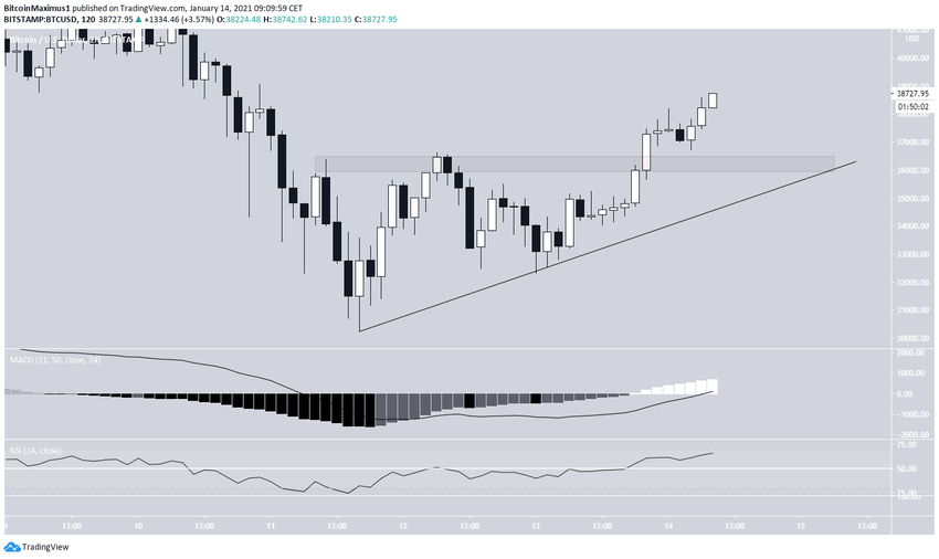 Außerdem folgt der Bitcoin-Kurs anscheinend einer aufsteigenden Trendlinie, die sich mit dem Unterstützungsbereich bei 36.200 USD überschneidet.