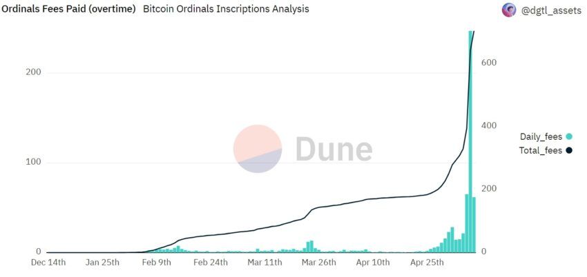 Die täglichen Mint-Gebühren für BRC-20-Token erreichten am 7. Mai mit 247 BTC (rund sieben Millionen USD) einen Rekordwert. Die nachfolgende Grafik zeigt einen unglaublichen Anstieg dieser Gebühren seit Ende April, was vorwiegend auf den Hype rund um die Bitcoin-Ordinals zurückzuführen ist. Mehr zu den Bitcoin-Ordinals gibt es hier.