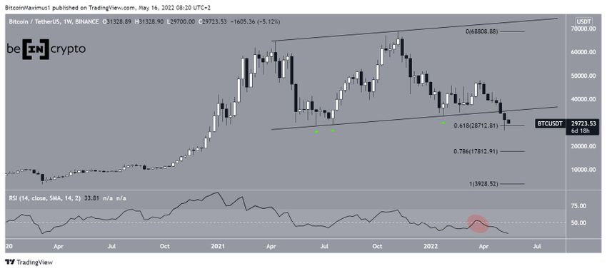 Der Wochentrend ist laut der technischen Analyse unseres Krypto-Traders Valdrin Tahiri tendenziell bärisch. Der Bitcoin Kurs ist erneut unter die wichtige 30.000 USD-Marke gefallen, nachdem der BTC Preis am 12. Mai 2022 von dem 0.618-Fib-Retracement bei 26.700 USD abgeprallt ist.