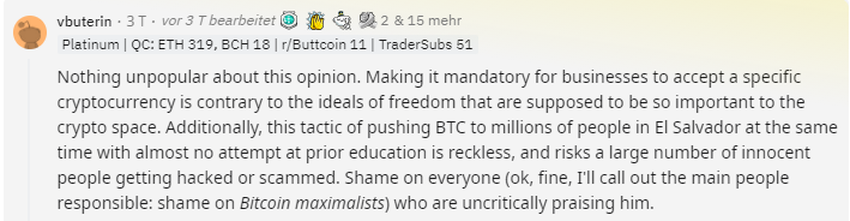 Der Ethereum-Mitgründer und Krypto-Experte Vitalik Buterin kritisierte letzte Woche die Bitcoin-Politik in El Salvador scharf. Vitalik Buterin schrieb in einem Reddit-Thread mit dem Namen “Unpopular opinion : El Salvador President Mr Nayab Bukele should not be praised by Crypto community”(“Unpopuläre Meinung: Der Präsident von El Salvador, Nayab Bukele, sollte von der Krypto-Gemeinschaft nicht gefeiert werden”):
