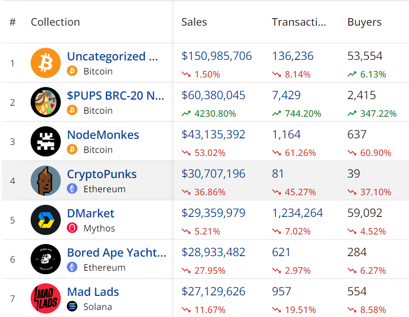 Die affenthemenbezogenen NFTs verzeichnete Gesamtverkäufe in Höhe von 28.933.804 USD. Dies entspricht einem Rückgang von 28,23 Prozent und bedeutet den sechsten Platz in Bezug auf den Verkaufswert.