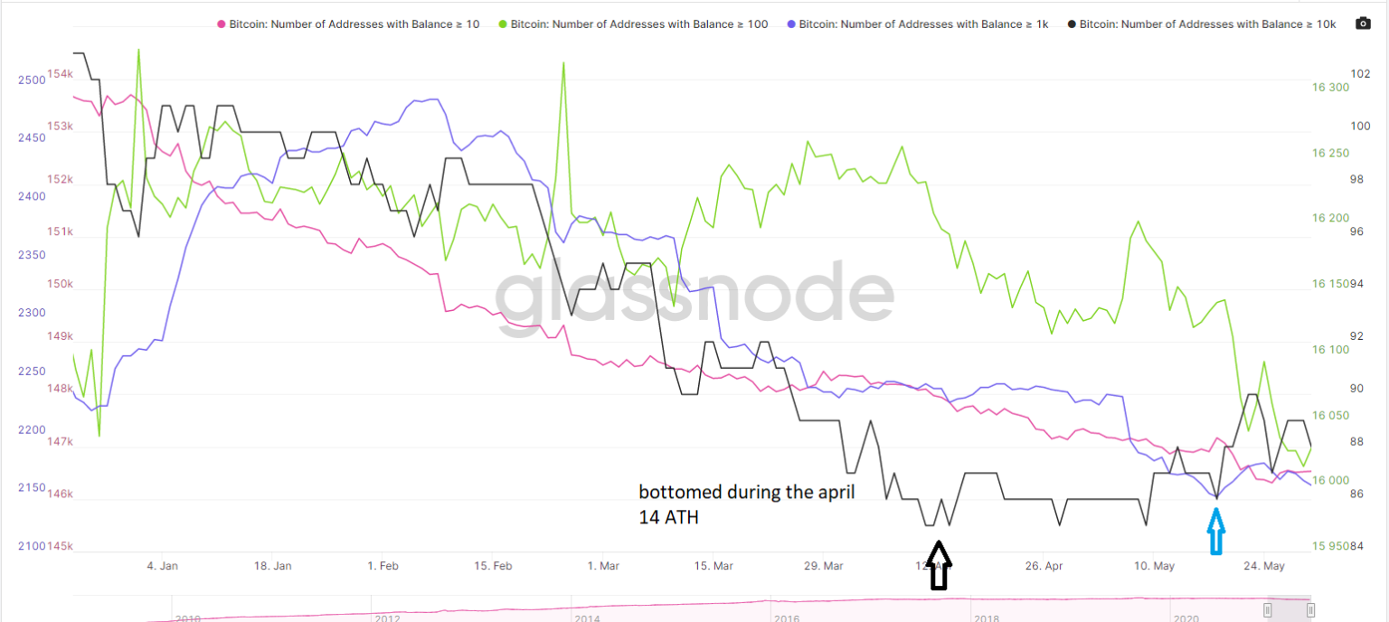 Allerdings ist die Zahl der Accounts, die über 10.000 BTC halten, seitdem wieder kontinuierlich angestiegen. Die Zahl der Accounts, auf denen mehr als 10.000 BTC liegen, erreichte am 19. Mai 2021 wie auch die Zahl der Accounts mit 10.000 BTC einen Tiefpunkt. Der Trend der Accounts, auf denen 10 bis 100 BTC liegen ähnelt dem derer, auf denen 1-10 liegen. Beide peakten im März und sind seitdem gefallen.
