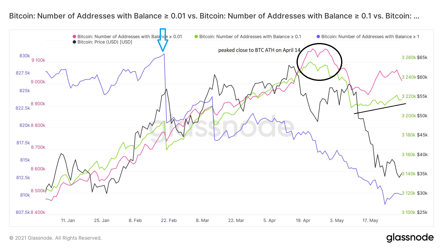 Die Anzahl der Adressen, auf denen verhältnismäßig wenig BTC liegen (von 0,01 bis 1 BTC) erreichte ihren Höhepunkt nahe dem Allzeithoch vom 14. April 2021 (schwarzer Kreis). Seitdem ist diese Zahl deutlich gesunken. Allerdings endete die Abwärtsbewegung am 13. Mai 2021. Trotz des Bitcoin-Kursrückgangs, liquidieren die Marktteilnehmer noch nicht ihre Bestände, halten sie jedoch mit einem Verlust (die Schwarze Linie).