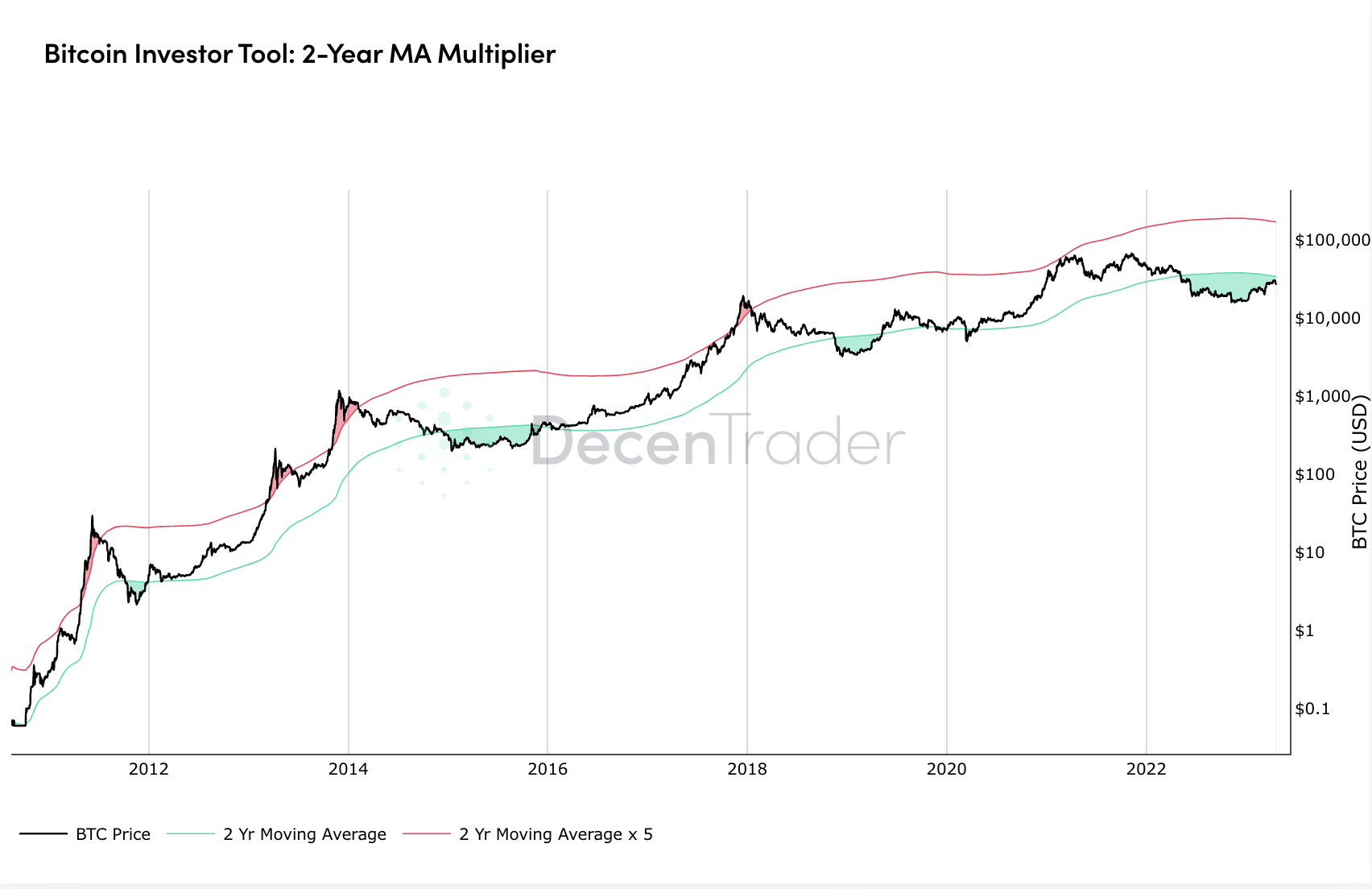Der Kauf von Bitcoin, wenn der Preis unter den 2-Jahres-MA (grüne Linie) fällt, hat in der Vergangenheit überdurchschnittliche Renditen erzielt. Bitcoin zu verkaufen, wenn der Preis über den 2-Jahres-MA x 5 (rote Linie) steigt, hat sich in der Vergangenheit als effektiv für Gewinnmitnahmen erwiesen.