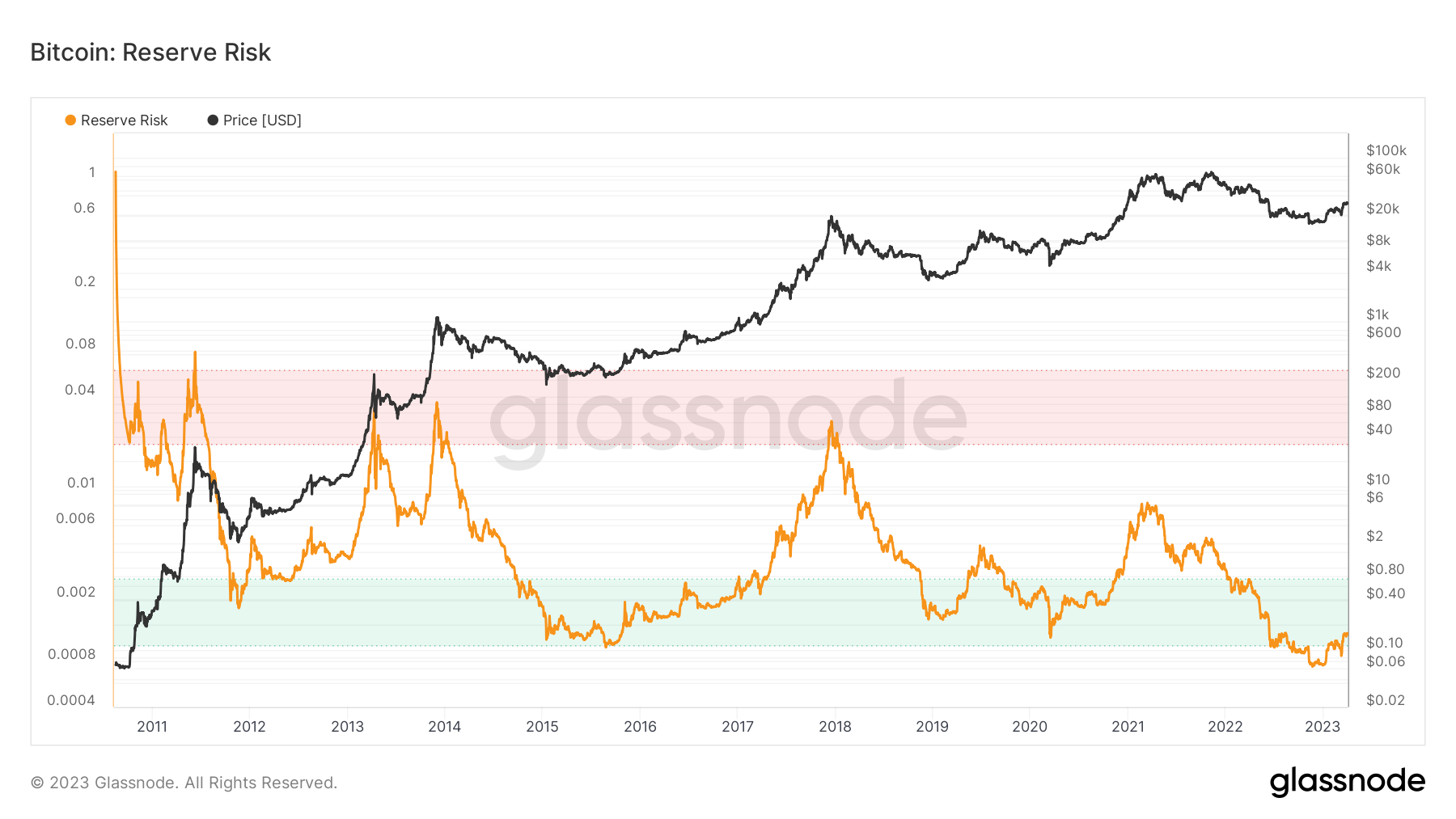 Das Reserve Risk (Reserverisiko) kann auch als Signal für einen günstigen Einstiegspunkt in Bitcoin genutzt werden. Es dient dazu, das Vertrauen langfristiger Investoren in Bezug auf den Bitcoin-Preis zu einem bestimmten Zeitpunkt zu bewerten. Wenn das Vertrauen hoch und der Preis niedrig ist, besteht ein attraktives Verhältnis zwischen Risiko und Ertrag für Investitionen (das Reserverisiko ist niedrig). Im Gegensatz dazu ist das Risiko-Ertrags-Verhältnis zu diesem Zeitpunkt unattraktiv, wenn das Vertrauen gering und der Preis hoch ist (das Reserverisiko ist hoch).