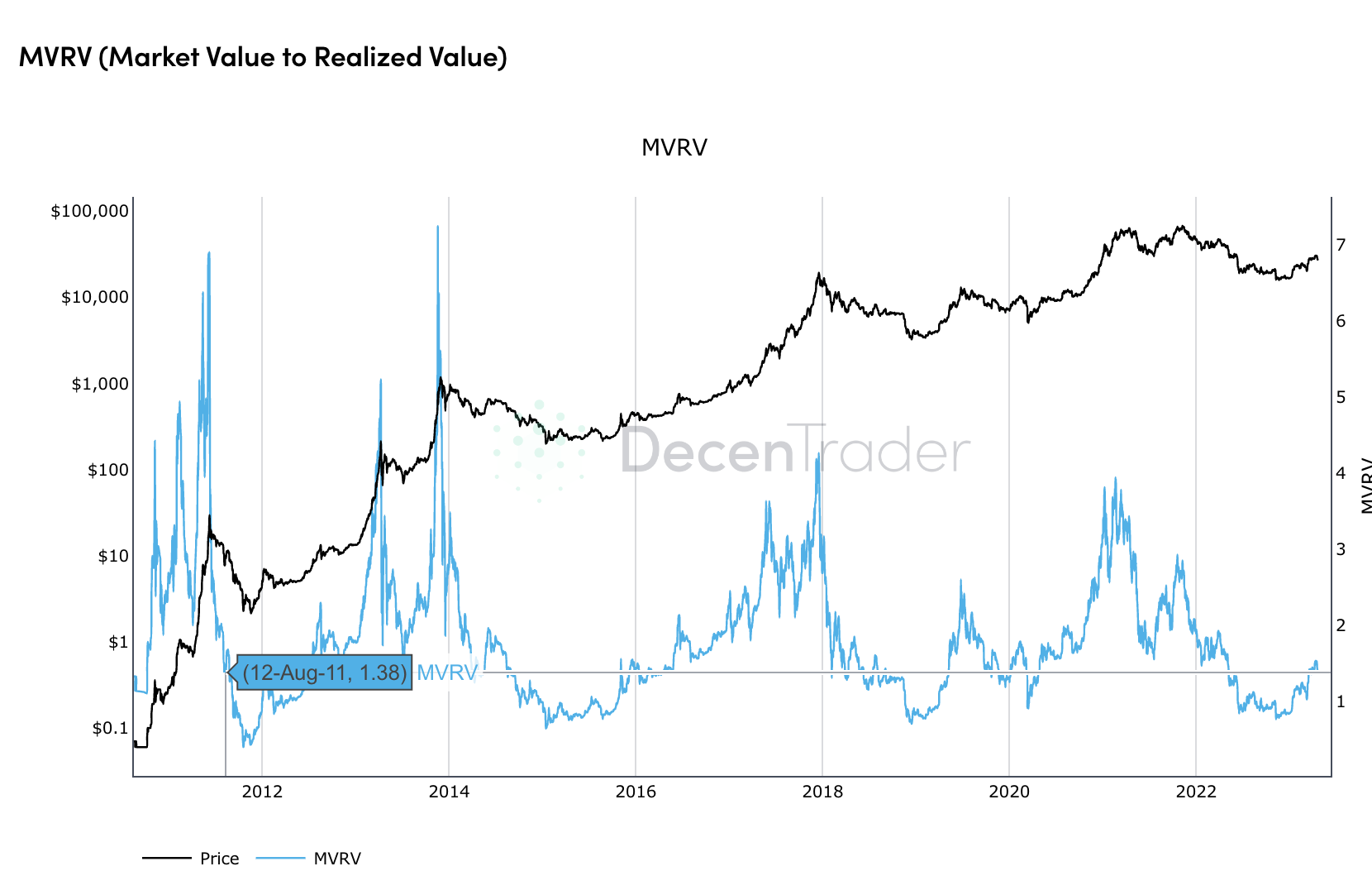 MVRV steht für Market Value to Realized Value (Marktwert zu realisiertem Wert) und ist eine Methode, um festzustellen, ob der Bitcoin-Preis zu einem bestimmten Zeitpunkt unter- oder überbewertet ist.