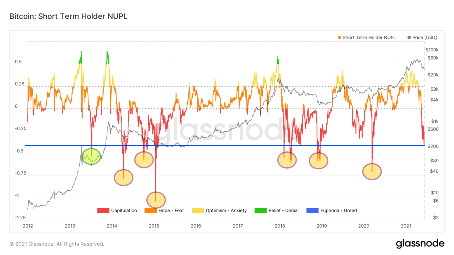 Die Bitcoin Bullen können jedoch darauf hoffen, dass sich der Bitcoin Kurs wie damals in dem Bull-Run von 2012/2013 verhalten wird. Damals gab es eine Double-Top. Der NUPL-Wert fiel in diesem Fall für die STHs zuerst stark ab (grüner Kreis), nur um sich ein paar Wochen später wieder schnell in die Bereiche der Hoffnung (Hope), des Optimismus (Optimism) und des Glaubens (Believe) zu bewegen.