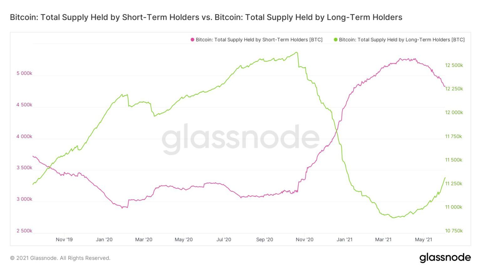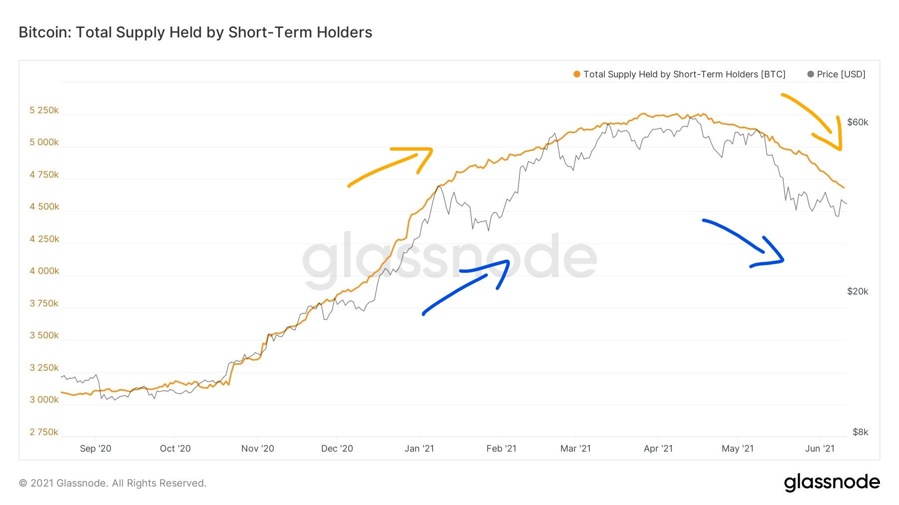 Im Gegensatz dazu stiegen im gleichen Bullenmarktzeitraum (Oktober 2020 bis April 2021) die Zahl der Positionen der kurzfristigen Halter deutlich an. Einige von ihnen schafften es sogar, in der Nähe des Höchststandes zu verkaufen, aber seither gibt es einen klaren Abwärtstrend bei den STH-Positionen.