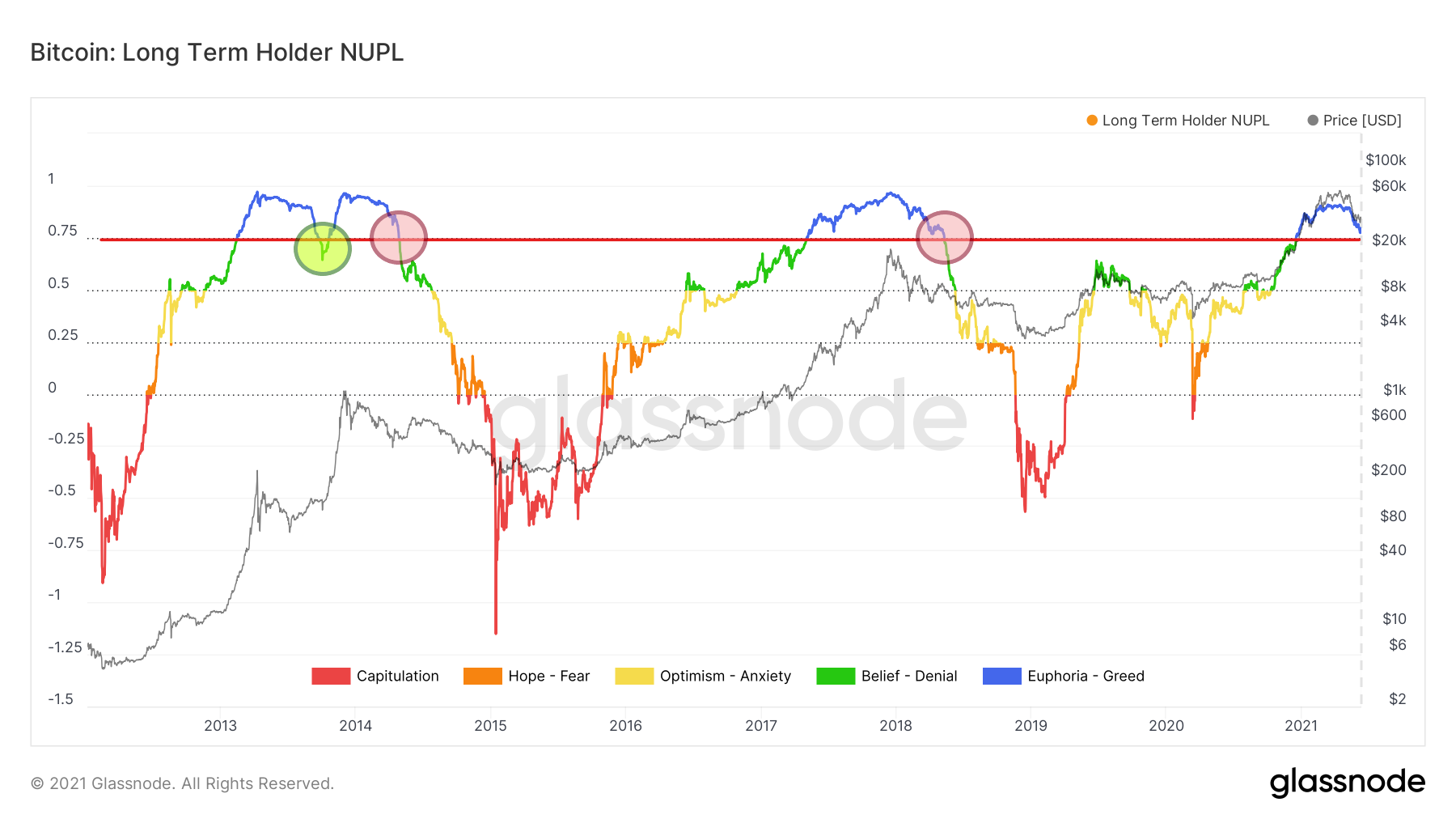Die einzige Ausnahme war der Doppelpeak-Zyklus. Zuerst tauchte die Kurve der langfristigen Inhaber kurz in den grünen Believe-Bereich (grüner Kreis) ein, nur um dann schnell wieder in einen Zustand der Euphorie und der Fortsetzung des Bullenmarktes zurückzukehren.