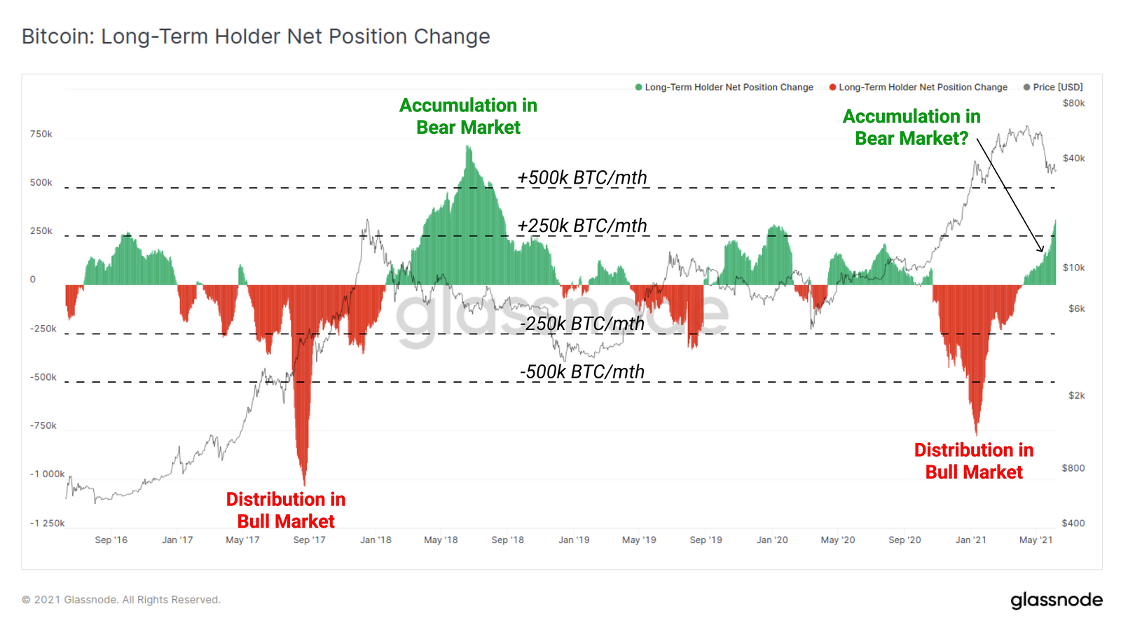 In einer kürzlich erschienene Analyse veröffentlichte Glassnode ein Diagramm über die Veränderung der Position von Langzeithaltern und suchte nach Parallelen zum Bitcoin-Zyklus von 2016/2017. Die Veränderung im Verhalten der LTHs, die wieder akkumulieren, könnte ein Zeichen dafür sein, dass ein Bärenmarkt bevorsteht.