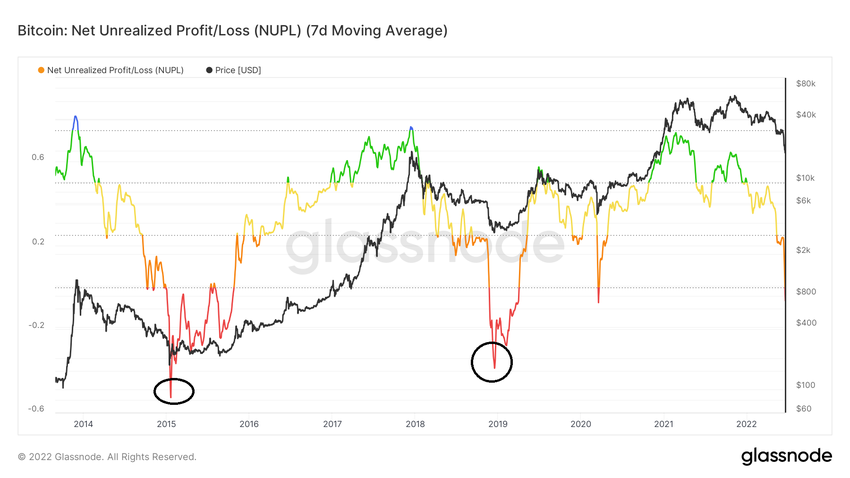 Bei dem aktuellen Zusammenbruch war dies allerdings nicht der Fall (blauer Kreis). Sobald der Indikator unter 0,25 fiel, setzte sich die Talfahrt fort, bis der NUPL am 19. Juni schließlich auf -0,06 fiel. Dieser Stand wurde auch im März 2020 erreicht (rote Kreise). Der Zusammenbruch führte zudem zu einem neuen Allzeittief des Indikators für unrealisierte Nettogewinne/-verluste.
