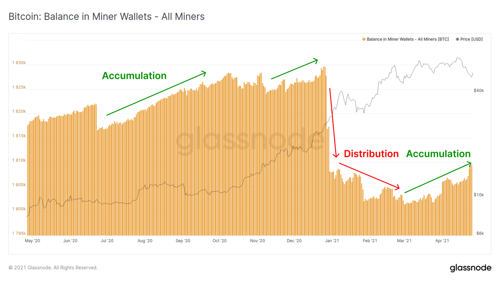 Dies ist eine noch nie dagewesene Situation und unterscheidet sich stark von der vorherigen Phase, in der Miner regelmäßig ihre Ressourcen verkauften. Trotz erhöhter Verkäufe im ersten Quartal 2021 sehen wir eine deutliche Akkumulation im April. On-Chain-Analyst @WClementeIII veranschaulichte diesen Trend, indem er das Miner Net Position Change Indikator-Chart teilte, das zwei Zyklen miteinander vergleicht:
