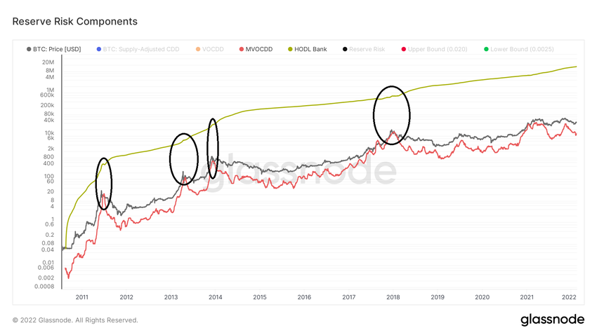 Am 24. Januar 2022 erreichte der Bitcoin-Reserve-Risk-Indikator einen Wert unter 0.0022 (den niedrigsten Wert seit Oktober 2020) und der BTC Kurs einen lokalen Tiefpunkt, der die letzte Makro-Bottom gewesen sein könnte. Allerdings war der Indikator meist für längere Zeit in diesem Bereich, wenn er einmal dort angekommen ist. Deshalb könnten wir noch eine weitere Konsolidierung oder einen tieferen Tiefpunkt des BTC Preises sehen.