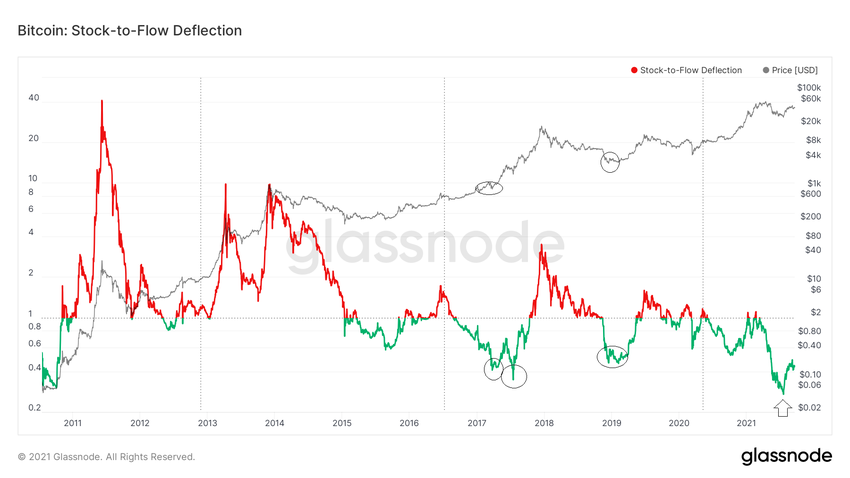 Außerdem schauen wir uns die Abweichung vom Bitcoin-Stock-to-Flow-Modell (STF) genauer an.