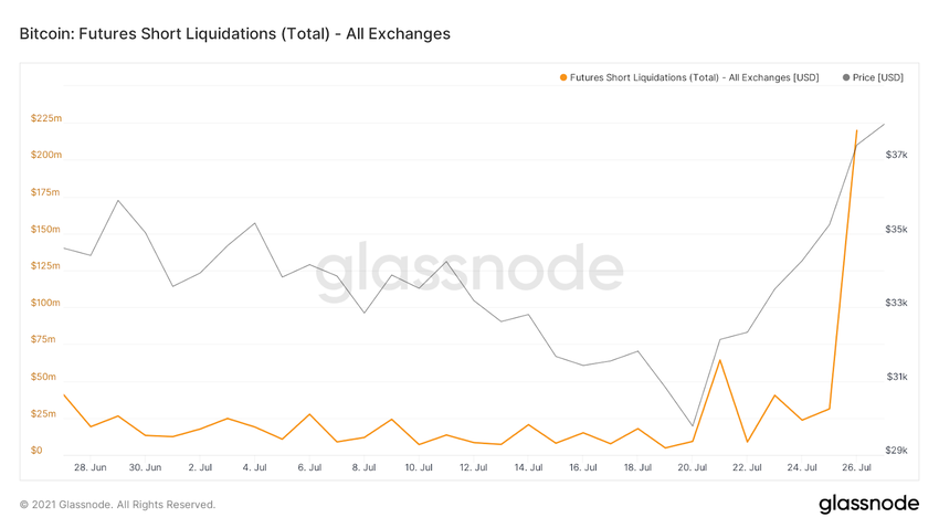 In den ersten Stunden vom 26. Juli 2021 gab es einen starken Anstieg des Bitcoinpreises. An diesem Tag sind Short-Positionen im Wert von 219 Millionen US-Dollar liquidiert worden. Das sind mehr als siebenmal so viel wie am vorherigen Tag.