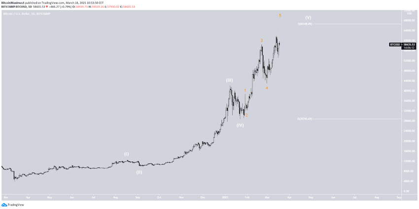Laut unserer Wellenanalyse befindet sich der Bitcoin Kurs gerade in der letzten Teilwelle (Orange) der letzten Welle (Weiß) eines bullischen Impulses ab, der im März 2020 begonnen hat.