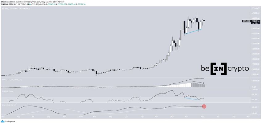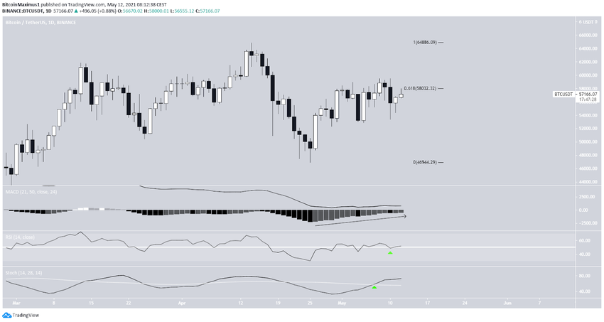 Der Tageschart hingegen wirkt relativ bullisch. Der Bitcoin Preis befindet sich aktuell in der Nähe des 0.618-Fib-Retracement-Levels bei 58.000 USD. Die technischen Indikatoren liefern uns bullische Signale. Der MACD steigt und ist beinahe im positiven Bereich angekommen und der RSI ist über die 50-Linie angestiegen. Zudem gab es vor kurzem ein „bullish Cross“ auf dem „Stochastic Oscillator“.