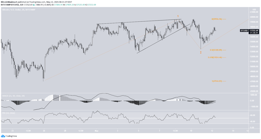 Die Kurzzeit-Wellenanalyse ist unten eingezeichnet. So wie es aussieht, ist der Bitcoin Kurs einer „leading Diagonal“ gefolgt und hat zum Schluss in ein aufsteigendes Dreiecksmuster durchlaufen. Der Bitcoin Kurs ist bereits von dem 0.5-Fib-Retracement-Level bei 53.300 USD abgeprallt.