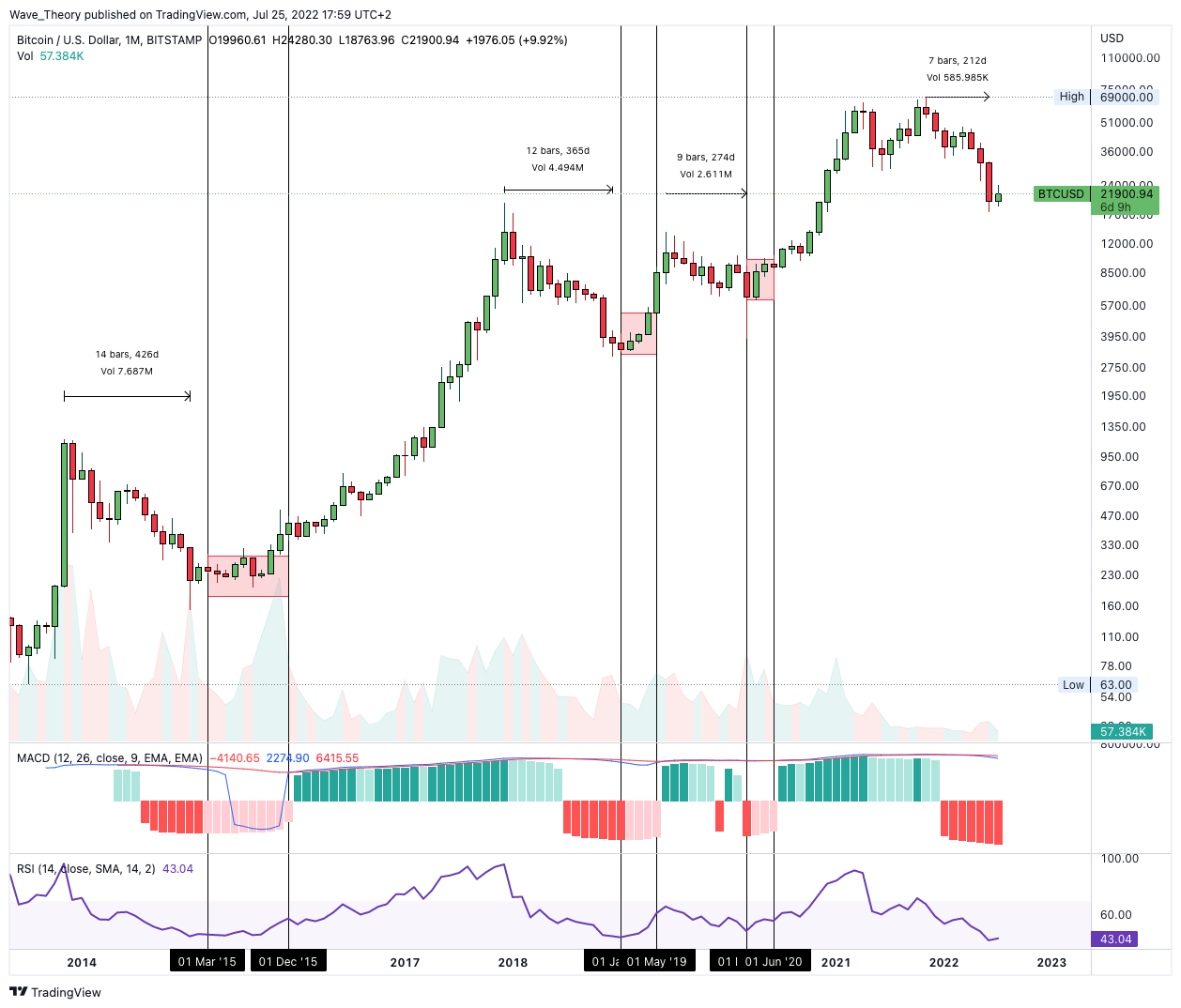 Schließlich wurde das Ende der letzten drei Bärenmärkte durch ein aufsteigendes Histogramm des MACDs im Monatschart gekennzeichnet. Anschließend folgte oft noch eine Konsolidierungsphase, in der sich der BTC Kurs eher seitwärts bewegte.