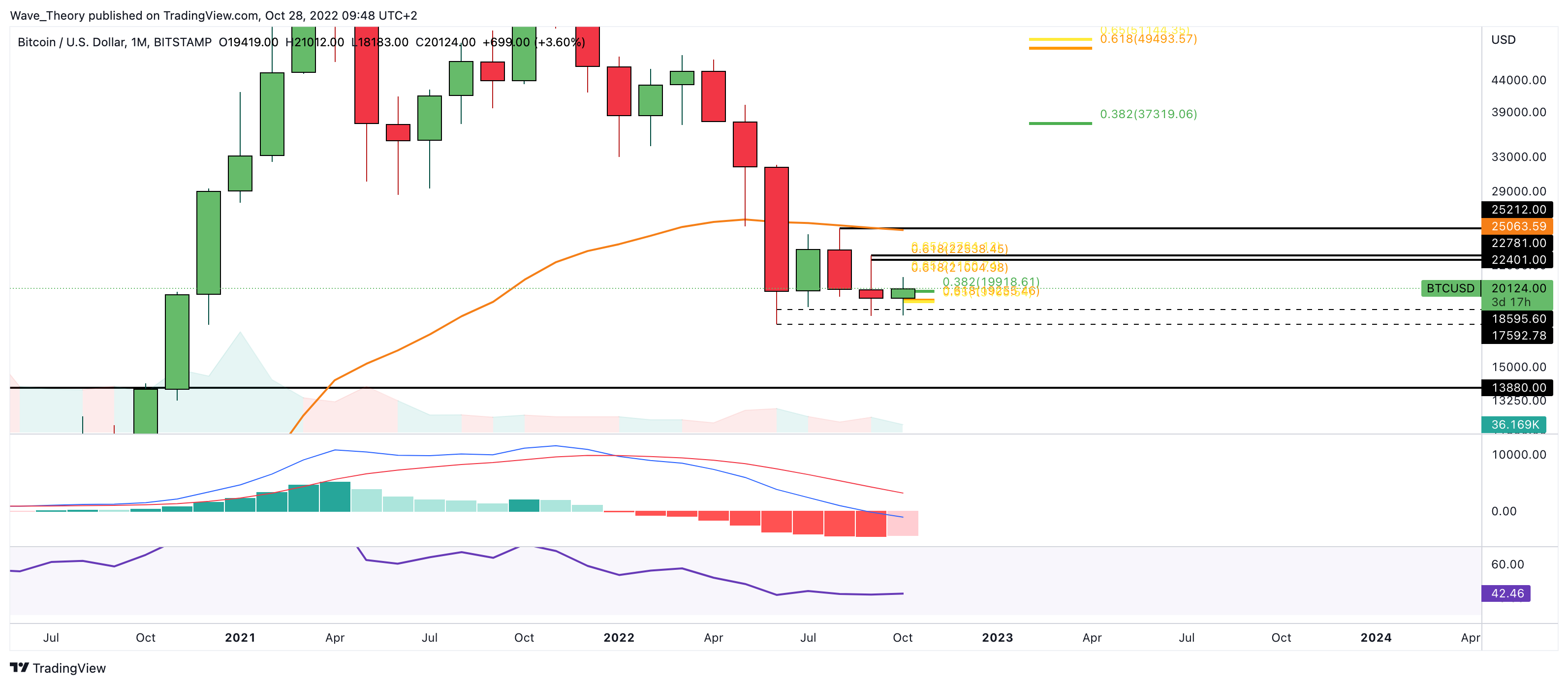 Wirklich bullisch ist aber die Tatsache, dass das Histogramm des MACDs in diesem Monat bullisch höher tickt und die Monatskerze in wenigen Tagen schließt. Dies wäre ein starkes Signal für eine Bodenbildung und das Ende des Bärenzyklus.
