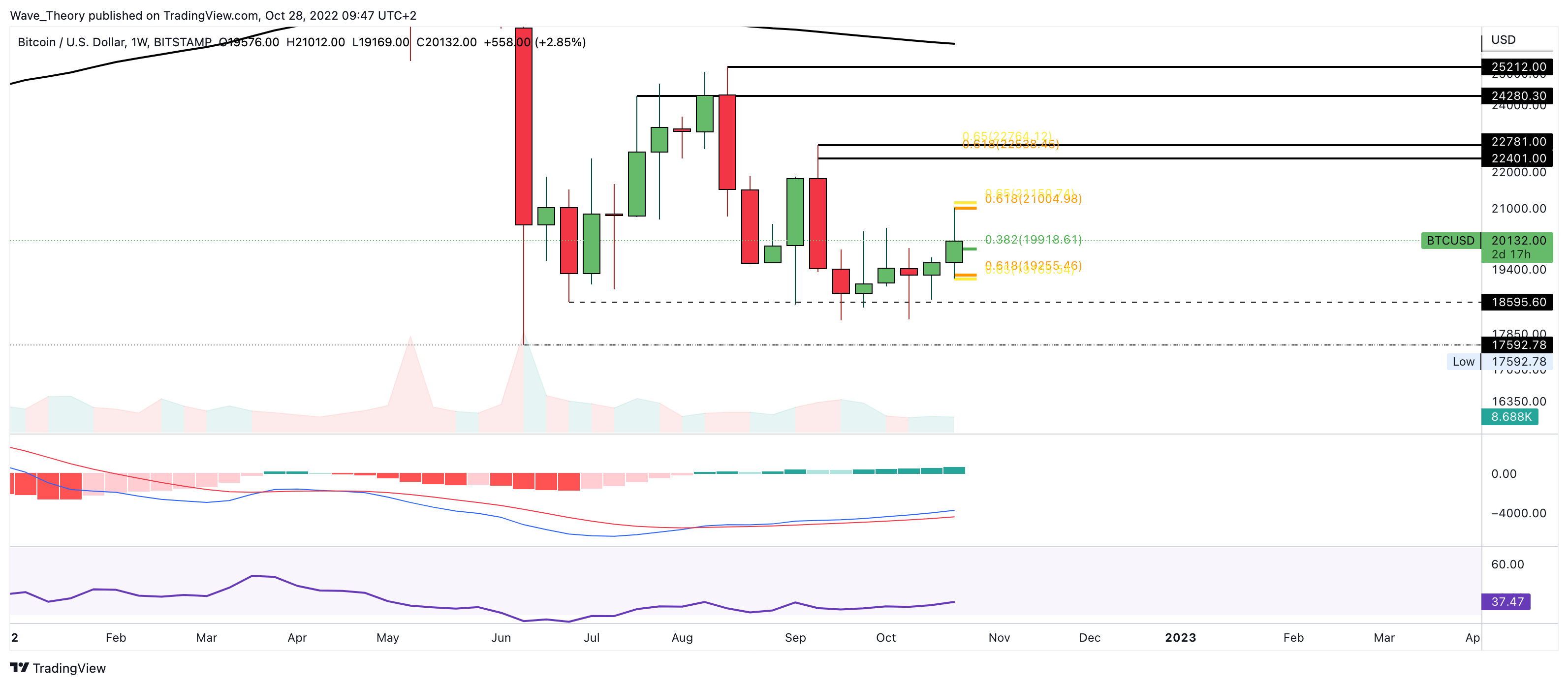Sollte Bitcoin die Golden Ratio bei rund 21.000 USD bullisch brechen, wartet bei rund 22.500 USD der nächste signifikante Fib Widerstand auf Bitcoin. Bei einem Bruch dieses Fib Niveaus wäre die Korrektur vorerst beendet.