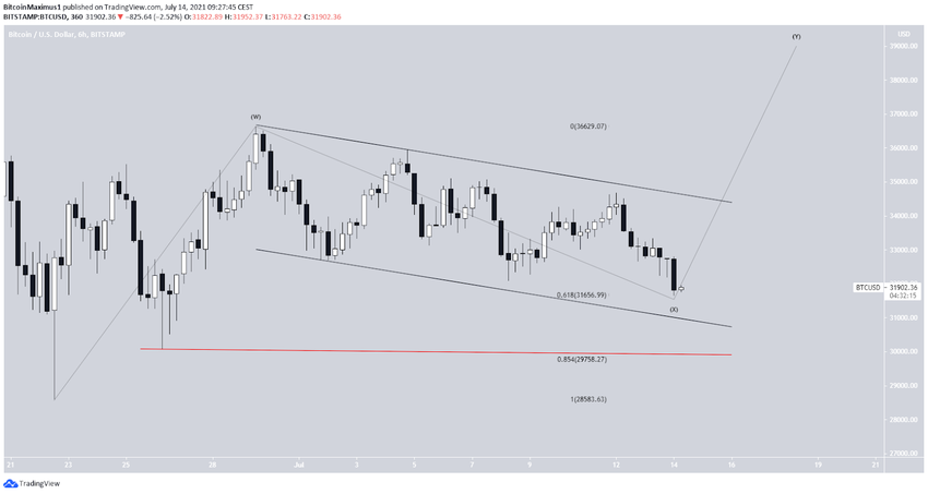 Die korrekte Wellenzählung kann momentan nicht eindeutig festgelegt werden. Der Bitcoin Preis ist seit dem Low vom 22. Juni 2021 (28.600 USD) eine Zeit lang ansteigen. In dem unten gezeigten Bereich gibt es jedoch ganz klar eine Three-Wave-Structure zu sehen. Darum ist die Aufwärtsbewegung in dem Bereich wahrscheinlich nicht der Anfang eines neuen bullischen Impulses. Sie ist entweder eine abgeschlossene Korrekturstruktur oder ein Teil von einer anderen.