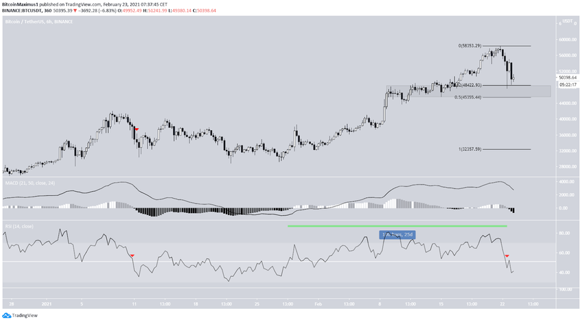 Auf dem 6-Stunden-Chart sieht man, dass der Bitcoin Preis für kurze Zeit beinahe auf das 0.382-Fib-Retracement-Level bei 48.422 USD gefallen ist. Das nächste Support-Level liegt bei 45.355 USD (das 0.5-Fib-Retracement-Level).