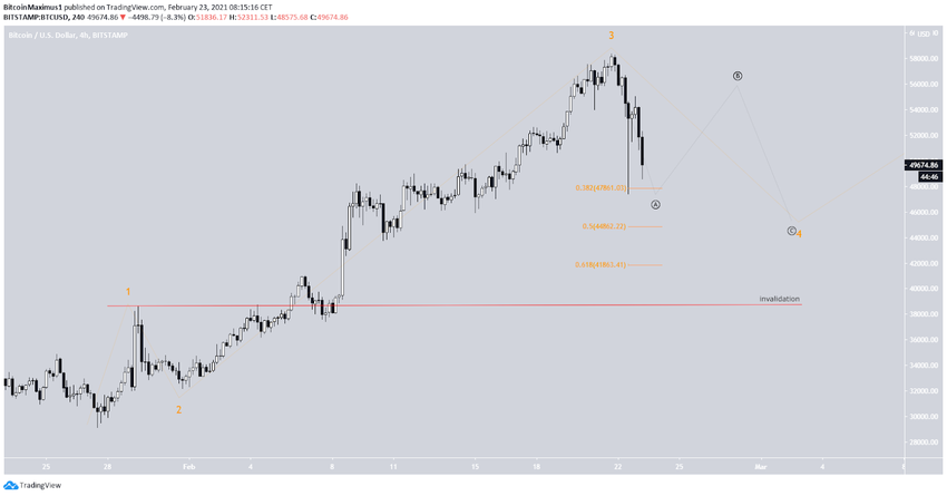 Der Bitcoin Kurs befindet sich wahrscheinlich in der vierten Welle eines bullischen Impulses (unten in Orange eingezeichnet), der am 28. Januar 2021 bei 29.000 USD begonnen hat. Nach der vierten Welle kommt es möglicherweise einem weiteren Kursanstieg. Der Hochpunkt der fünften Welle liegt wahrscheinlich bei über 60.000 USD.