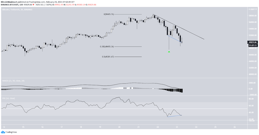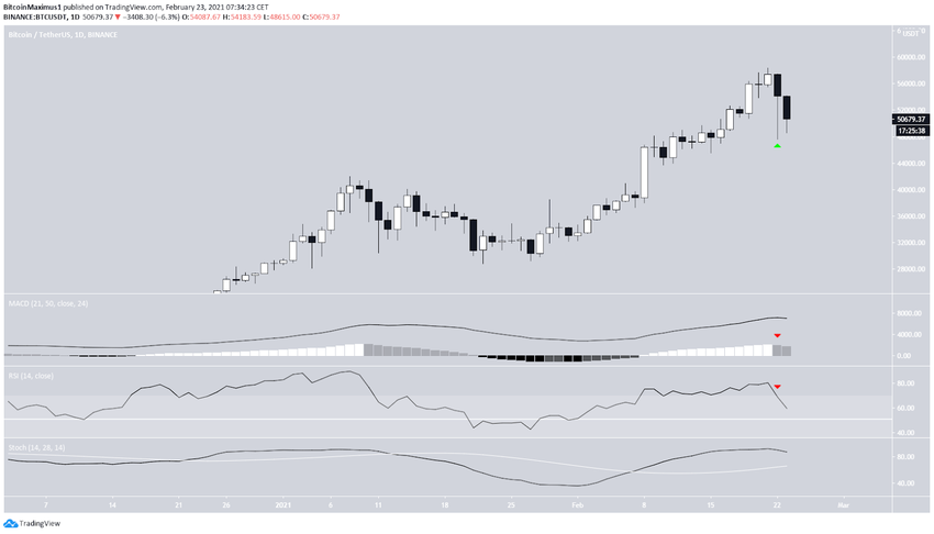 Der Bitcoin Preis ist am 22. Februar 2021 innerhalb von einigen Stunden auf 47.662 USD gefallen. Allerdings war der Preis nur für kurze Zeit in der Nähe des Allzeittiefs und hat sich schnell erholt. Darum sieht man auf der entsprechenden Tageskerze eine lange, untere Wick (unten in Grün eingezeichnet). Heute, am 23. Februar 2021, ist der Bitcoin Kurs weiter gefallen und befindet sich zum Zeitpunkt der Veröffentlichung der Nähe des gestrigen Tagestiefs.