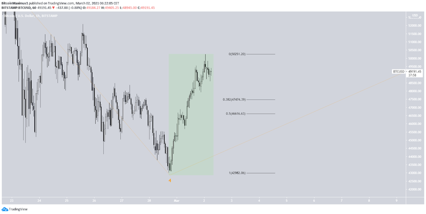 Am 1.März 2021 ist der Bitcoin Preis beinahe auf 50.000 USD angestiegen, nachdem er zuvor auf das Support-Level bei 44,600 USD gefallen ist.