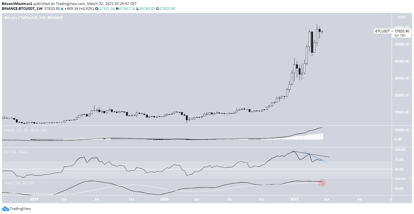 In der letzten Woche konsolidierte der Bitcoin Kurs weiter, nachdem er am 13. März 2021 ein neues Allzeithoch erreicht hat. Darum hat die entsprechende Wochenkerze die Form einer Doji-Candlestick. Diese ist normalerweise ein Zeichen für Unentschlossenheit auf dem Markt.