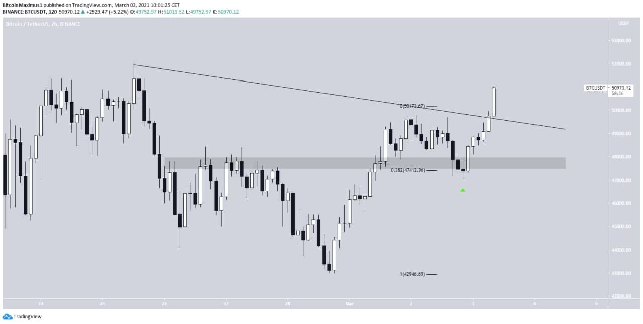 Auf dem 2-Stunden-Chart sieht man, dass der Bitcoin Kurs das ehemalige Widerstandslevel bei 47.500 USD nun als Support fungiert. Zudem konnte er bereits die absteigende Trendlinie überwinden. Möglicherweise kehrt der Bitcoin Preis nochmal auf die Trendlinie zurück, um sie als Support zu validieren.