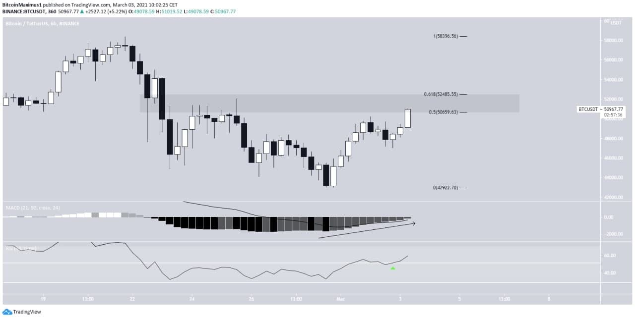 Lass uns einen Blick auf den 6-Stunden-Chart werfen. Der Bitcoin Preis befindet sich aktuell in der Nähe des Widerstandslevels bei 50.650 USD-52.450 USD befindet. Die beiden Werte entsprechen dem 0.5- bzw. 0.618-Fib-Retracement-Level des letzten Allzeithochs.