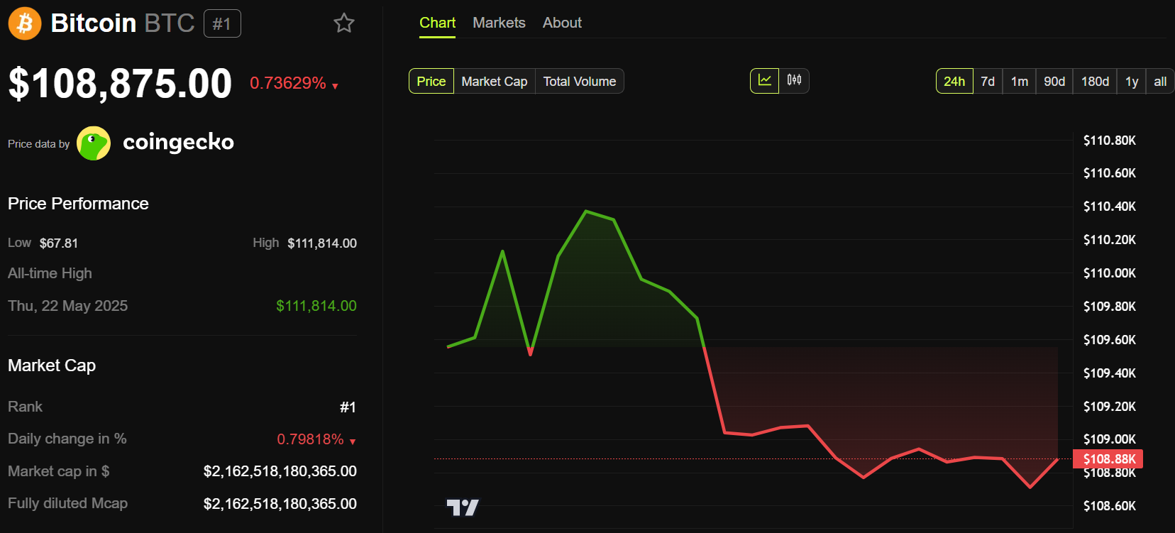 Zum Zeitpunkt dieses Schreibens wurde Bitcoin für 108.875 USD gehandelt, ein Rückgang von 0,7 Prozent in den letzten 24 Stunden.