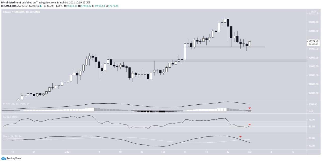 Auf dem Tageschart sieht man, dass der Bitcoin Preis wieder etwas angestiegen ist, nachdem er auf das kleine Support-Level bei 44.800 USD gefallen ist. Der Bitcoin Kurs hat das Level also nun zum zweiten Mal als Support validiert.
