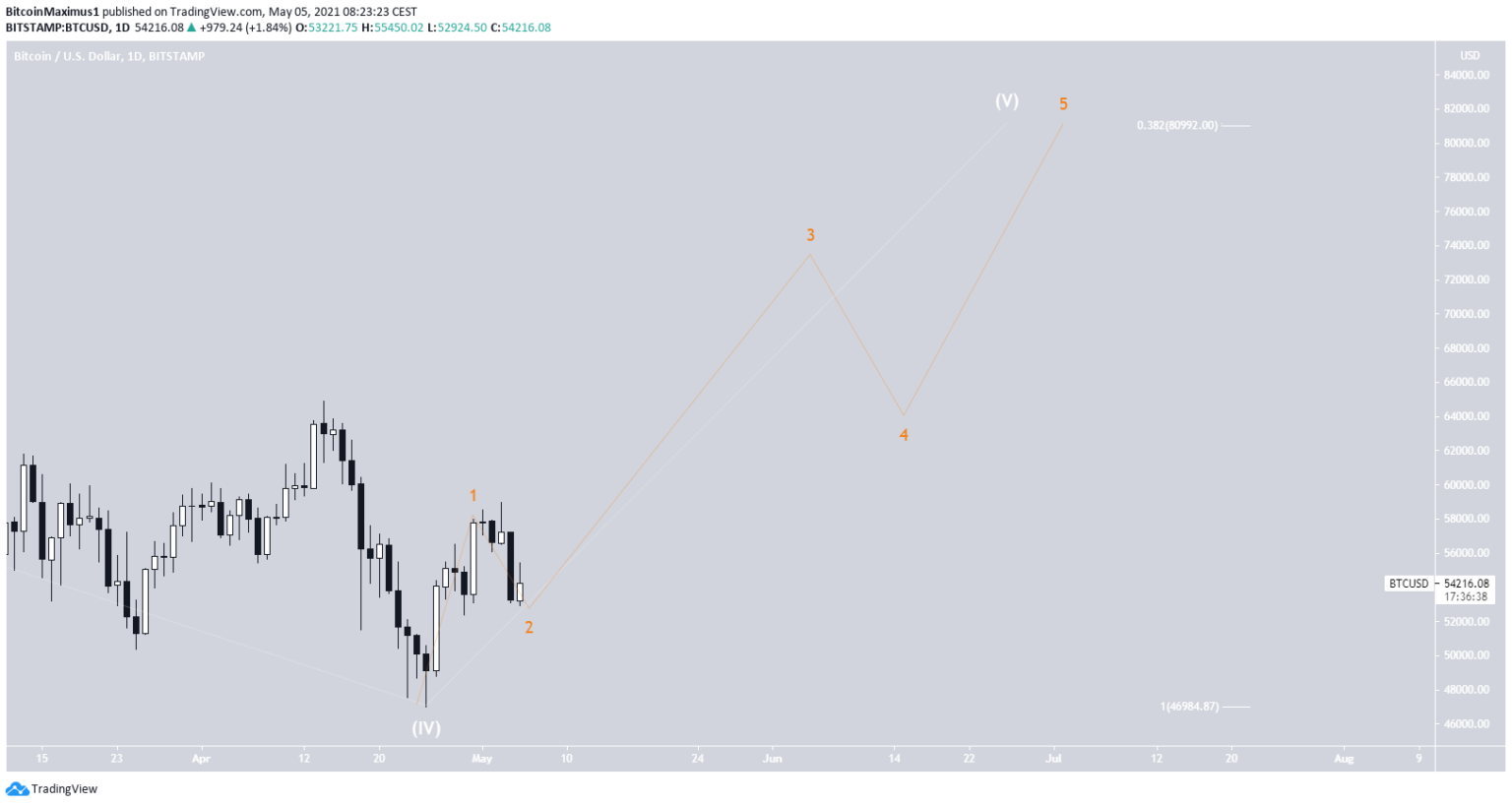 Der Bitcoin Kurs befindet sich wahrscheinlich gerade in der fünften Welle (Weiß) eines bullischen Impulses, der im März 2020 begonnen hat. Der Hochpunkt der letzten Welle liegt wahrscheinlich bei 81.300 USD bzw. 102.300 USD. Man erhält die Preisziele, indem man eine Fib-Projektion der ersten drei Wellen einzeichnet. Die Teilwellenzählung ist unten in Orange eingezeichnet. Der Bitcoin Kurs hat wahrscheinlich bereits die ersten beiden Teilwellen abgeschlossen. Sollte der Bitcoin Kurs unter den Tiefpunkt der ersten Welle (47.004 USD) fallen, dann ist diese Wellenzählung ungültig.