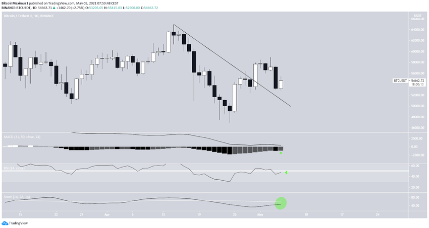 Der Bitcoin Kurs erzielte gestern, am 4. Mai 2021 ein Tageshoch von 57.200 USD. Danach ist der BTC Preis auf das Tagestief bei 53.046 USD gefallen. Deshalb hat die gestrige Tageskerze die Form einer „bärischen engulfing Candlestick“. Es ist allerdings gut möglich, dass der Bitcoin Kurs bei dem Drop die absteigende Widerstandslinie, über die er zuvor ausgebrochen ist, als Support validiert hat Trotz des Drops liefern uns technischen Indikatoren nach wie vor bullische Signale. Der MACD steigt nach wie vor an. Außerdem könnten wir bald ein „bullish Cross“ auf dem „Stochastic Oscillator“ sehen.