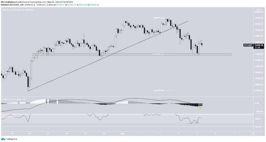 Auf dem 2-Stunden-Bitcoin-Chart siehst du, dass der Bitcoin Preis rund 2 Tage lang gefallen ist. Vor kurzem ist der Bitcoin Kurs unter die aufsteigende Support-Linie ausgebrochen, die seit dem Tiefpunkt vom 26. April 2021 existiert.