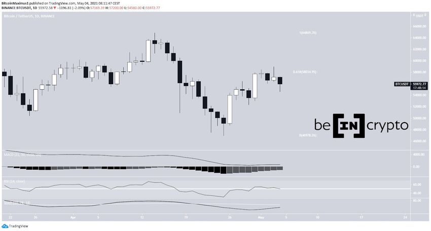 Anschließend ist der Bitcoin Preis wieder gestiegen, nachdem er das 0.382-Fib-Retracement-Level (weiß) erreicht hat, das bei ca. 54.000 USD liegt. Es ist möglich, dass dies bereits der Wendepunkt der kurzfristigen Abwärtsbewegung war und der Bitcoin Preis wieder steigt. Allerdings signalisieren sowohl der MACD als auch der RSI, dass sich die jetzige kurzfristige Abwärtsbewegung fortsetzen wird. Der RSI ist erst vor kurzem unter 50 gefallen.