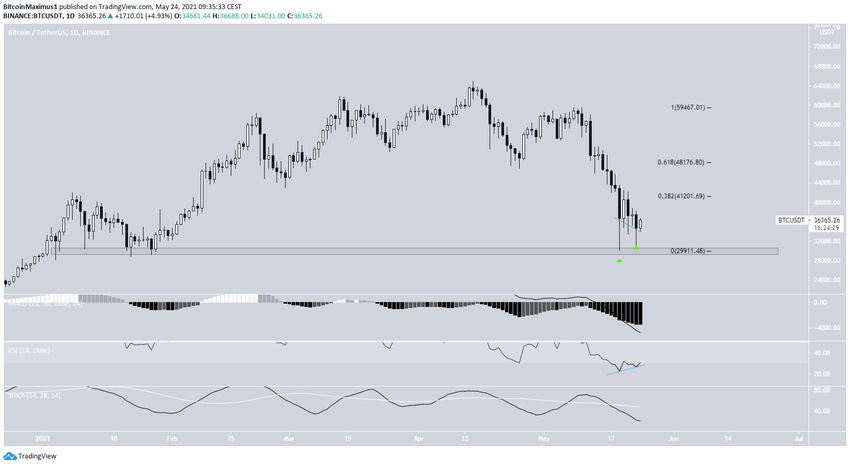 Der Tageschart liefert uns ebenfalls bärische Signale, der MACD befindet sich im negativen Bereich und der „Stochastic Oscillator“ fällt, der RSI befindet sich im überverkauften Bereich. Allerdings entwickelt sich gerade eine bullische Divergenz auf dem RSI, der gerade dabei ist, sich der 30-Linie anzunähern. Außerdem gab es, seitdem der RSI wieder ansteigt, zwei lange, untere Wicks zu sehen. Der Kaufdruck ist also momentan recht hoch. Die nächsten beiden Widerstandslevel liegen bei 41.200 USD und 48.200 USD (das 0.382- und das 0.618-Fib-Retracement-Level).