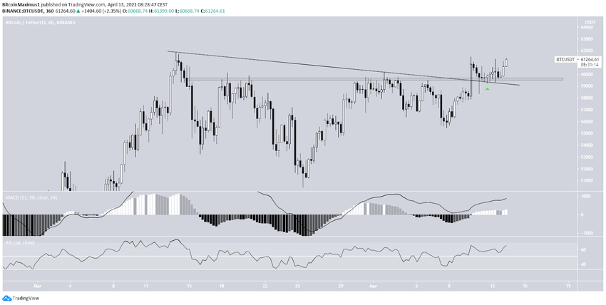 Auf dem 6-Stunden-Chart siehst du, dass der Bitcoin Kurs am 10. April 2021 über die absteigende Trendlinie ausgebrochen ist, die seit dem letzten Allzeithoch vom 13. März 2021 intakt war. Anschließend ist der Bitcoin Preis weiter angestiegen. Die technischen Indikatoren liefern uns überwiegend bullische Signale. Der Bitcoin Kurs wird sich also bald einem neuen Allzeithoch nähern.