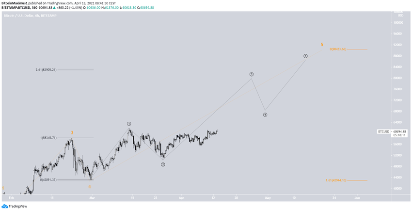 Laut unserer Langzeit-Wellenanalyse befindet sich der Bitcoin Kurs in der fünften Welle (Weiß) eines bullischen und letzten Teilwelle (Orange) Impulses. Der Hochpunkt der letzten Welle liegt wahrscheinlich in der Nähe von 90.000 USD. Man erhält das Preisziel, indem man eine Fib-Projektion auf die ersten drei Teilwellen anwendet bzw. ein externes Fib-Retracement auf den Tiefpunkt der vierten Welle einzeichnet.