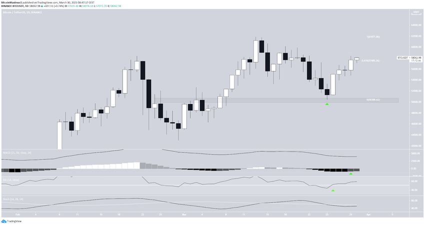 Gestern, am 29. März 2021 erreichte der Bitcoin Kurs ein Tageshoch bei 58.405 USD. Außerdem konnte der Bitcoin Kurs gestern über das 0.618-Fib-Retracement-Level ansteigen. Bei diesem Level kommt es häufig zu Trendumkehrungen.