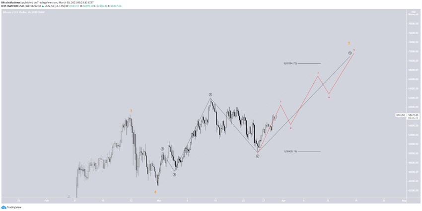 Diese Wellenanalyse ist im Vergleich zu der oben gezeigten Wellenanalyse etwas spekulativer. Falls sie allerdings korrekt ist, dann liegt der Hochpunkt der letzten Welle in der Nähe von 69.000 USD.